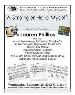 Lauren Phillips, a candidate for cantorial ordination from the Debbie Friedman School of Sacred Music at Hebrew Union-College Jewish Institute of Religion presented her Senior Recital. The concert featured music from the Postcard Project, an initiative during the 1930s in which prominent composers like Kurt Weill, Aaron Copland, and Darius Milhaud were asked to create arrangements of Israeli folk songs that were printed on postcards by the Jewish National Fund. The postcards were created to inspire Jews in the Diaspora to make aliyah, and the songs were amongst the first examples of secular Hebrew music to reach the European shtetls. Participating in this project inspired the composers involved to confront their identity as Jewish artists in the secular world and to subsequently cultivate a relationship with Eretz Yisrael. Lauren's program explored the way in which religion influenced both the sacred and secular compositions of the Postcard Project composers, with special attention given to their inclusion of folk idioms and liturgical texts.